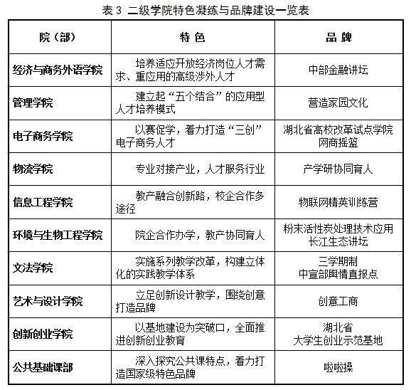 学科专业建设为人才培养提供了较好的基础条件。建校以来,学校确定突出“工商”,经、管、工、文、法、艺等学科协调发展的学科专业格局。拥有2个湖北省重点(培育)学科(工商管理、新闻传播学),1个“楚天学者”设岗学科(工商管理);2个湖北省重点培育本科专业(电子商务、新闻学);5个湖北省高校战略性新兴(支柱)产业人才培养计划项目(物流管理、旅游管理、环境工程、电子商务、物联网工程);4个湖北省“专业综合改革试点”项目(新闻学、电子商务、旅游管理、物流管理);1门湖北省精品课程(网络营销),3门湖北省精品资源共享课程(计算机基础、品牌形象设计、物流管理概论);2个湖北省重点建设实验教学示范中心(经济与管理、环境与生物工程),1个湖北省虚拟仿真实验教学中心(经济与管理),2个湖北省高校实习实训基地(家事易现代物流与电子商务、长联制药与环生),1个省级大学生创新创业示范基地,高等学校创新能力提升计划(2011计划)单位。