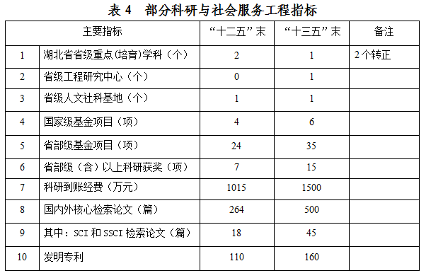 落实“植根武汉,面向湖北,辐射全国,服务一线”的服务定位,加快与湖北省的大中型企业、武汉市及洪山区政府等的合作,抓大项目,建大平台,形成一批科技专利,产出科研成果和经济效益。“十三五”期间实现科研经费和社会服务项目经费每年递增,取得的高水平、高技术含量的专利数量在现有基础上翻一番。学校社会服务的功能增强,社会效益明显。