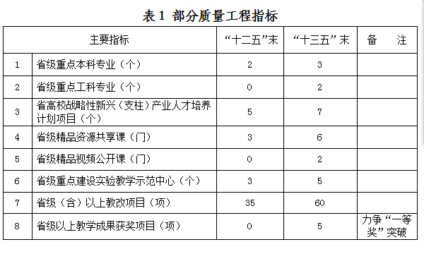 十三五期间,确保通过本科教学合格评估的同时,在“拔尖”人才与“合格”人才教育、大学生个性发展、学科专业品牌、优质课程、名师团队、实验室等方面重点建设,促进教学质量上新台阶。