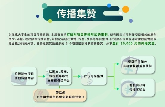 创新的传播玩法,不仅能让项目被更多人关注,也有助于带动民众的环保意识,促进环保公益事业的可持续发展。为了强化参赛学生的传播意识,同时激发带动更多人参与环境保护,本届“培育计划”拓宽项目传播方式,鼓励大学生通过不同传播形式和渠道,包括但不限于图文、海报、短视频、直播等,宣传项目亮点与特色,扩大公益的参与面、受益面和影响力,让环保内容尽可能触达到更广泛的人群。表现出色的项目,不仅能在重点扶持项目的评比中取得优势,还有机会获得“环保创新传播奖”。