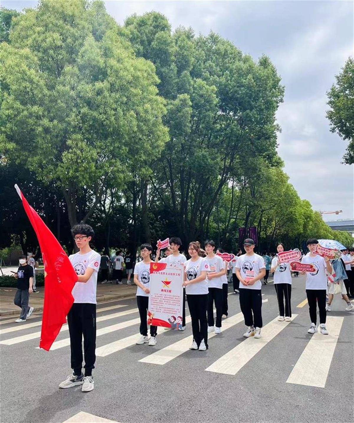 快闪现场,身着民国服装的青年学生慷慨激昂高举“外争主权,内惩国贼”“停止内战一致对外”等标语,致敬和传承先辈们的革命精神;身穿防护服、头戴面罩的青年志愿者,正在测温,开展抗疫志愿服务;还有一身迷彩服的学生正面对团旗,以最宏亮的声音庄严宣誓……