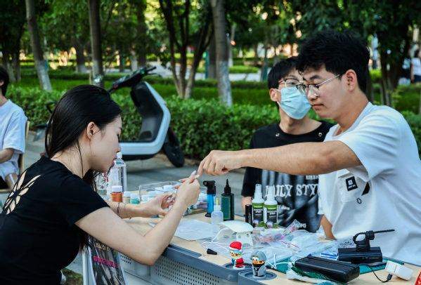 图为学生体验美甲 摄影:杨培