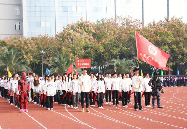 伴随着雄壮激昂的《运动员进行曲》,国旗队以及来自各二级学院的师生代表队昂首挺胸、英姿飒爽,迈着铿锵有力的步伐依次入场,大家各出奇招,通过服装走秀、啦啦操、现代舞、双人舞等各具特色的表演,展现出师生奋发昂扬、活力四射的精神风貌和青春风采,赢得现场阵阵掌声。