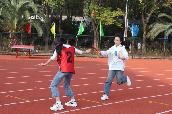 在教职工“一圈到底”项目比赛中,只见老师们11人一组,手牵着手,通过整齐划一的“一二一”活动身体,以最快的速度将呼啦圈穿过自己的身体并传递给队友,吸引了不少学生在一旁摇旗呐喊、加油助威。在“旱地龙舟”的比赛中,只见老师们8人一组跨坐在龙舟上,齐心协力一同抬起龙舟,以双脚为桨,步调整齐地冲向终点……现场气氛紧张激烈,充满了欢声笑语,老师们一致表示既锻炼了身体,还收获了快乐、放松了心情,大家纷纷在赛后合影留念,共同记录这一美好时刻。