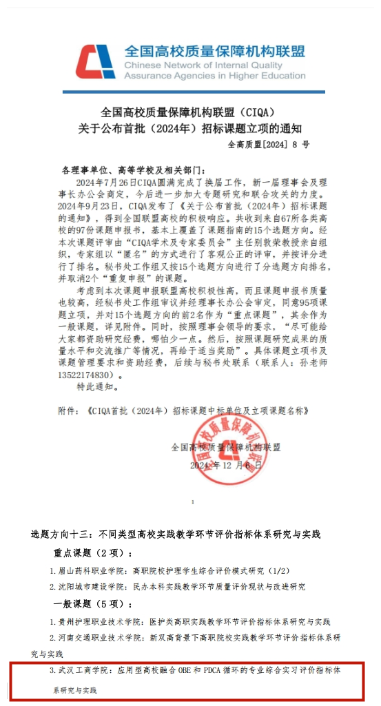 新闻中心讯(记者 芮雨欣)近日,全国高校质量保障机构联盟(CIQA)公布了首批(2024年)招标课题立项的名单。由beat365中文官方网站教学质量监测与评估中心副主任吕凯波主持申报的课题《应用型高校融合OBE和PDCA循环的专业综合实习评价指标体系研究与实践》获一般课题立项,学校成为湖北省同类高校中唯一获该课题立项的单位。