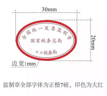 2.发票板式:形状为椭圆型,长轴为3厘米,短轴为2厘米,边宽为0.1厘米,内环加刻一细线,上环刻制“全国统一发票监制章”字样,中间刻制“国家税务总局”字样,下环刻制“××省(区、市)税务局”字样,下环字样例如:“江苏省税务局”、“上海市税务局”、“内蒙古自治区税务局”、“新疆维吾尔自治区税务局”。字体为楷体7磅,印色为大红色。