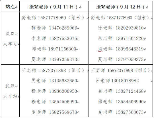 2021年9月11日、12日是我校新生报到日。为方便广大新生顺利报到,我校在汉口火车站、武汉火车站、武昌火车站、傅家坡长途汽车站四个站点设有迎新接待点,并安排有迎新专车接站。现将各站点接站老师及其联系方式公布如下: