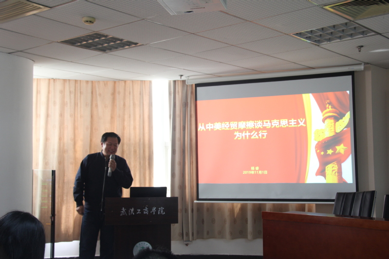 最后由电子商务学院党总支书记杨睿同志就“从中美贸易摩擦谈马克思主义为什么行”主题进行分享。中美贸易摩擦是目前国际形式热点,杨睿同志就中美贸易摩擦的事实、实质、原则、战略、部署讲解,分析了中国目前的现状——中国已进入社会主义新时代、中国已经成为了世界经济格局的枢纽,以及美国为什么要挑起贸易摩擦。最后分享了马克思主义为什么行,马克思主义是历史发展的结果,马克思主义准确的预测了信息时代和生产力高度发展后的社会形态。杨睿书记讲解案例与理论相结合,会场老师踊跃参加互动答题,他将生涩的理论知识讲得生动有趣,得到全场的一致好评。杨书记分享完就本次论坛作出了总结,本次论坛圆满结束。