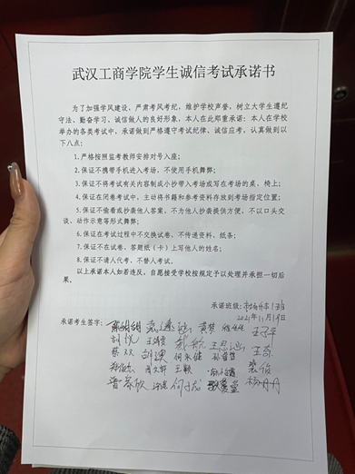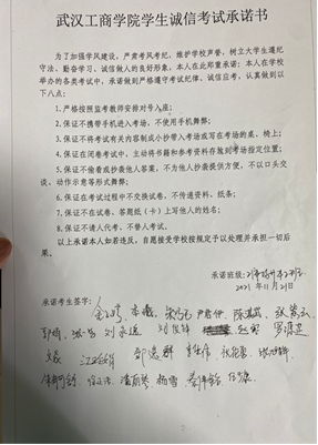 组织学生签写《诚信考试承诺书》。各班级组织学生签写诚信考试承诺书,让学生严格要求自己,并做到自我杜绝各类考试违纪、舞弊行为发生。