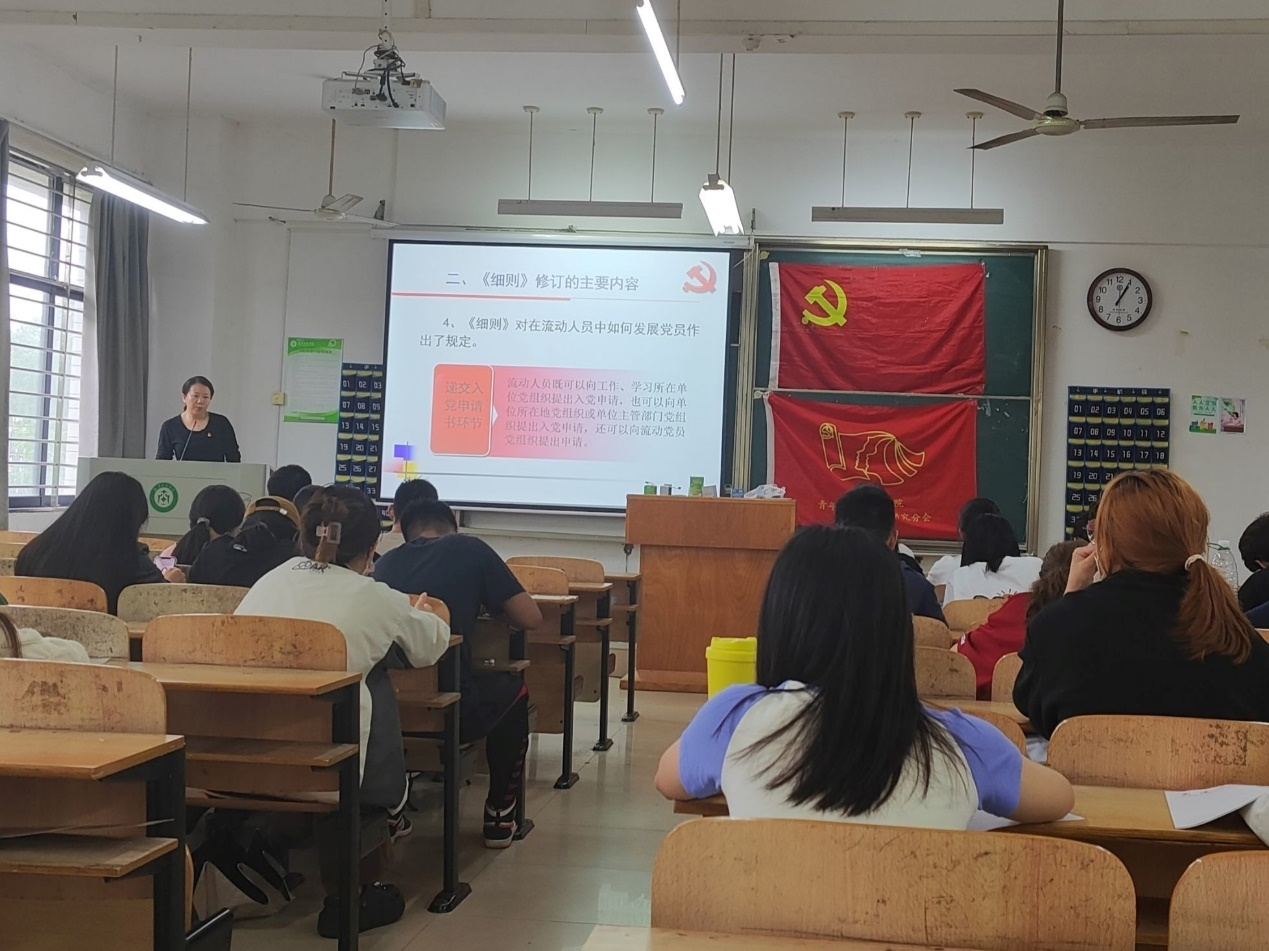 然后,王曼老师讲述了《细则》的主要修订内容,让我们了解党要管党,从严治党的要求,发展党员程序作出了调整,强化党组织在发展党员工作中的领导责任。还告诉党校同学发展党员的具体操作,使其对如何入党有了更好的理解,懂得了大致的流程。最后,王曼老师简单地讲述beat365中文官方网站发展党员工作流程及材料规范,评选规范。