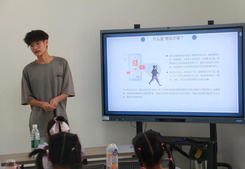 针对当前针对未成年人诈骗案件增多的情况,服务队特别强化了防诈骗教育。志愿者们针对乡村儿童认知特点,巧妙创设贴近生活的模拟情景,如“陌生网友索要信息”、“免费游戏皮肤陷阱”等,引导孩子们在角色扮演中识别潜在风险。他们用通俗易懂的语言,教会孩子们保护个人隐私信息、警惕网络诱惑,并牢记紧急求助渠道。生动的教学形式让孩子们在笑声中提高了警觉,掌握了应对技巧。