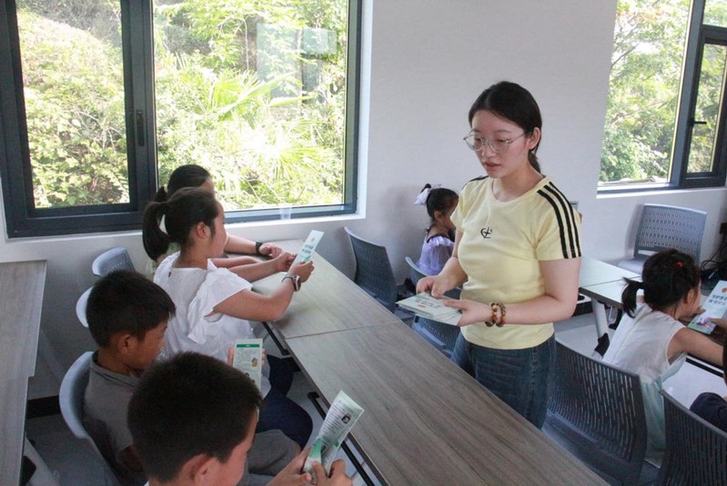 图为志愿者为小朋友们分发防溺水宣传页 摄影:胡杰