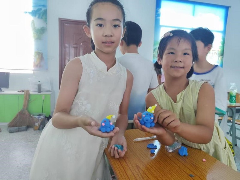紧接着,志愿者们带领孩子们进入超轻黏土的奇妙世界。志愿者先示范了几种基础造型的捏法,如圆形、条形、片状,还教大家如何通过组合这些基础造型做出简单的小动物和水果。孩子们发挥天马行空的想象,有的用黏土捏出了栩栩如生的冰激凌,有的制作了色彩斑斓的花朵,还有的则创意十足地捏出了一个动漫形象。志愿者们在旁巡回指导,及时帮助孩子们解决制作中遇到的问题,课堂上充满了欢声笑语。