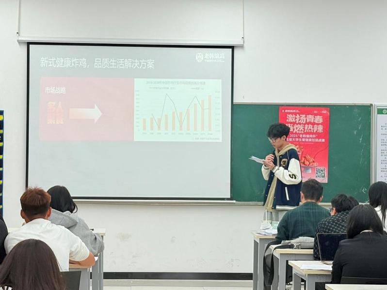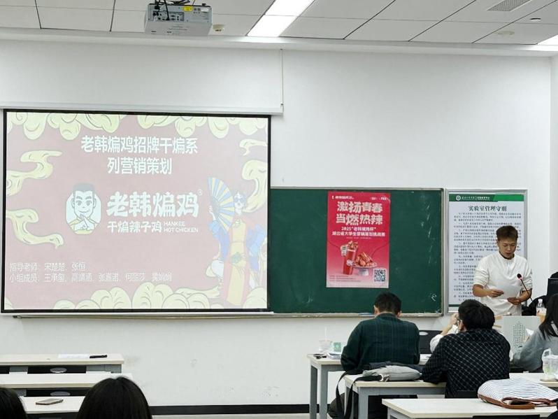 在参赛队伍中,“有信心的队”以“老韩煸鸡招牌干煸系列营销策划”为主题,在指导老师宋楚楚、张恒的带领下,小组成员王承玺、高靖涵、张嘉诺、何丽莎、黄娟娟从产品特色与市场需求出发,深度挖掘老韩煸鸡干煸辣子鸡的风味优势与文化内涵。他们的方案为老韩煸鸡干煸系列打造了一套“风味+文化+传播”三位一体的营销体系,展现出对品牌内核的精准把握与对市场趋势其专业且富有创意的策划思路得到评委老师好评。