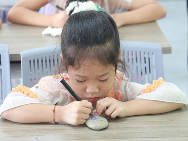 孩子们在志愿者的指导下,全情投入创作:有的屏息凝神勾勒线条,有的大胆尝试配色,有的兴奋地交流灵感。石头在孩子们的手中瞬间焕发生机:可爱的小兔子、家乡风景、神秘的海底世界、还有动画片中的动漫人物,栩栩如生地跃然石上。颜色在石头上绽放,不仅描绘出童真的图案,更倾注了孩子们专注的喜悦和无边的想象力。这堂生动有趣的艺术实践课,不仅让孩子们体验到亲手创造的成就感,更是在他们心中悄然播撒下发现美、创造美的种子,让艺术在指尖流淌,梦想在方寸间起航。