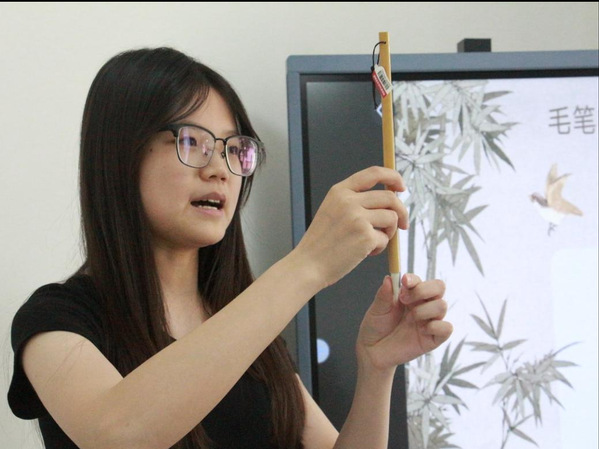 图为志愿者老师介绍毛笔 摄影:胡杰