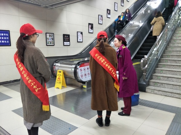 早上7点,志愿者们坐了一个多小时公交和地铁到达宝通寺地铁站,在地铁工作人员的耐心讲解下,掌握基本的知识与具体操作,同时熟知在岗时的注意事项,如:在岗时不能玩手机;不能与同行的志愿者闲谈影响工作;身体不要倚靠墙壁或栏杆,要注意志愿者的仪态;如遇有人不慎在电梯上摔倒要提醒后迅速按停电梯,以免造成更大伤害等。