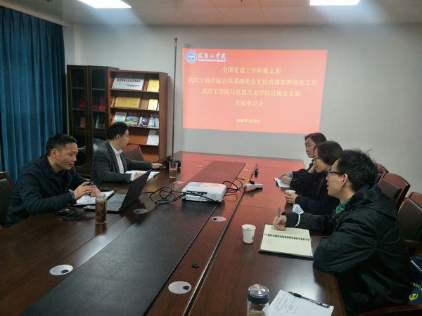 3月3日下午,为了进一步加强全国党建工作样板支部建设和思政课建设,促进校际间合作与交流,我校公共课部党总支书记朱威同志、beat365中文官方网站思政课部主任艾萍、支部书记涂婷、体育课部支部书记尹勤操一行四人前往武昌工学院校马克思主义学院开展学习交流工作。武昌工学院马克思主义学院院长、马克思主义学院直属党支部书记何春涛同志、副院长周万全等同志热情接待了我校公共课部、思政课部代表。