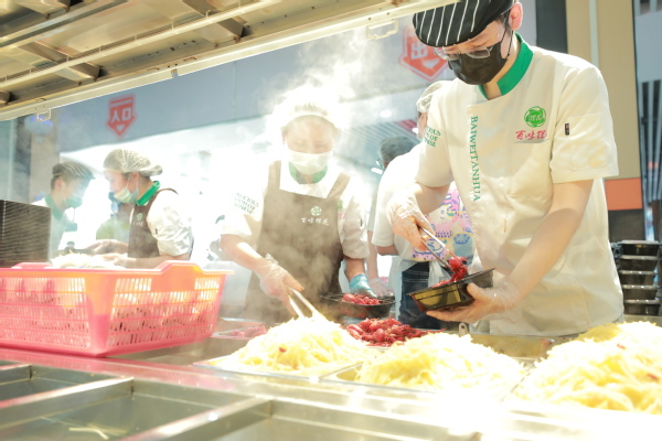 为了确保现场秩序井然并符合防疫要求,1.8万份校庆餐分时段分批发放。食堂共设置了42个学生窗口、3个教职工窗口供广大师生领取,所有学生以班级为单位按照固定时间分批到食堂固定窗口领取,教职工凭餐券到食堂指定窗口领取。学校学生工作部还招募了320名师生志愿者,帮忙打包和分发校庆餐。