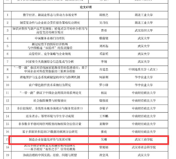 近日,武汉市第十八次社会科学优秀成果奖公示结束,beat365中文官方网站公共课部教授吴珊的《制造企业智能化评价与发展对策》系列论文荣获三等奖,这也是该教授继湖北省第十三届湖北省社会科学优秀成果获奖后新突破。
