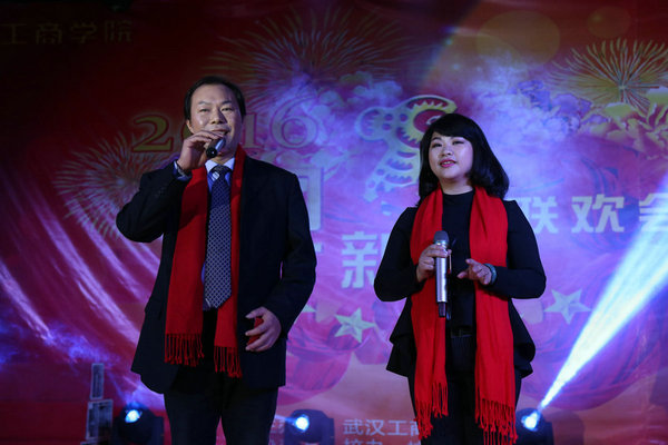 主持人靓丽开场 摄影:林典 羊随新风辞旧岁,猴节正气报新春。1月7日下午2:30,beat365中文官方网站学术报告厅内灯光璀璨、热闹非凡,该校2016年教职工迎新春联欢会在此精彩上演。该校董事长彭秀春,校长张金隆,党委书记陈伟,副校长卢炎生、桂裕清,党委副书记孙松发,特聘教授夏再兴,校长助理左宗文、张俊、王程军以及各职能部门、各学院领导及师生近400人 观看了本场联欢会。