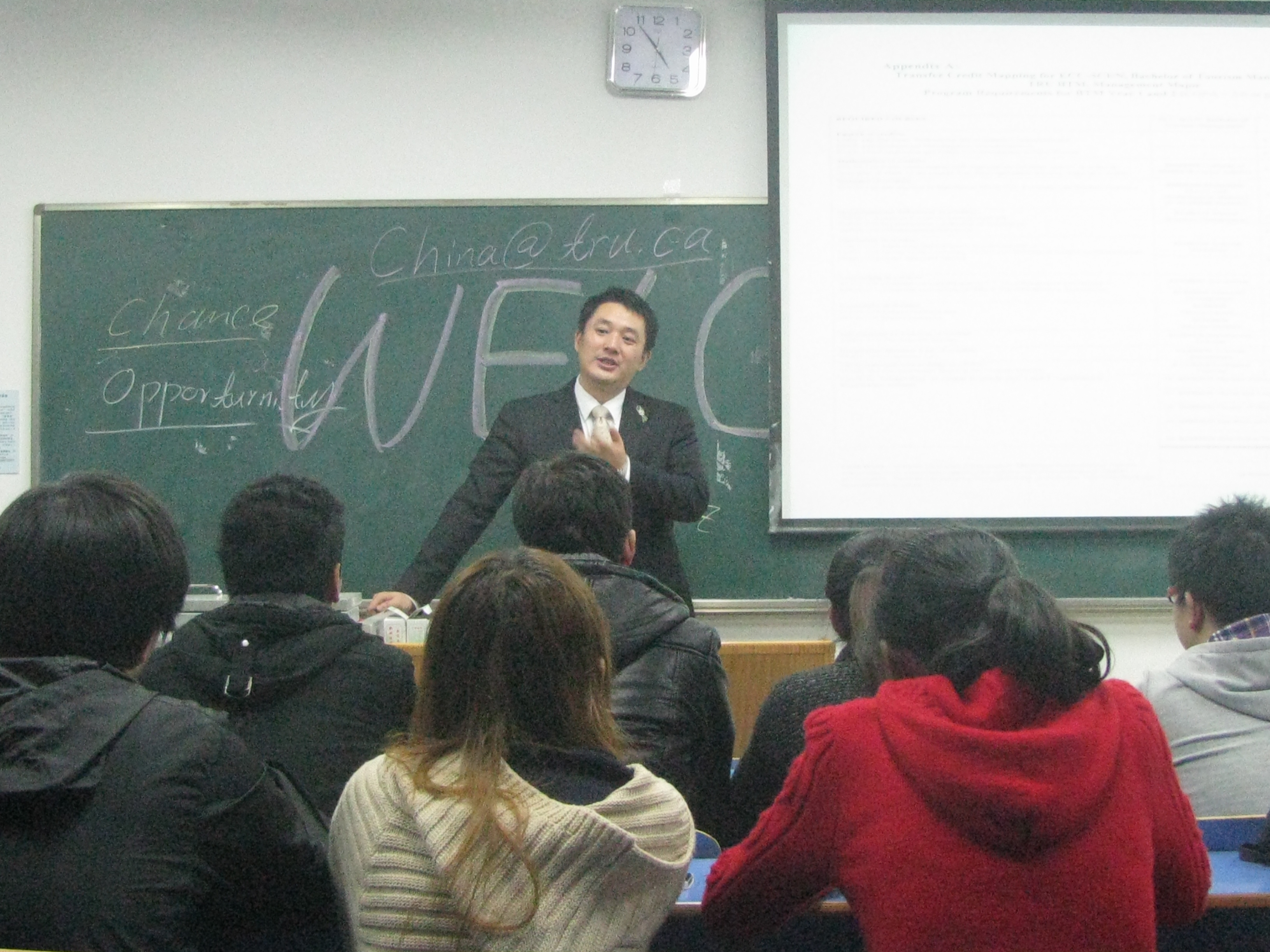 2012年11月15日,加拿大汤姆逊大学校方代表Richard Zhu从上海飞赴我校,为2011级“中加2+2”旅游管理国际班的学生做了一次精彩的演讲。 开场的宣传片里,汤姆逊大学优美的校园风景让在场同学大呼向往。而在同学们关心的教学质量上,Richard Zhu随后就为大家介绍道:“建于1970年的汤姆逊大学(Thompson Rivers University, TRU)是一所可颁发学士文凭、大专文凭证书的公立大学,目前能够提供包括商科、计算机、环境、旅游、艺术在内的100多个种类的学士学位教育和大专文凭证书教育,其文凭全球认证。学校不仅设有1至2年的转学分课程,便于学生转入排名更高的学府,还专门为非英语国家的学生提供各级英语强化课程和大学预科课程。就其与我校合作“2+2”办学的旅游管理来说,该专业在全加排名第二,有非常好的就业前景。户外拓展及野外生存是国际稀缺专业,也是汤姆逊的重点培养方向。汤姆逊大学现有学生13000多人,其中国际留学生达1600人,来自全球50多个国家和地区。