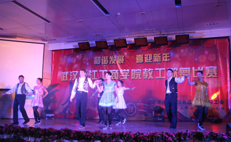 当日,全校教职工以优美的舞姿和动听的歌声演绎了一场节日盛典。歌舞会的高潮由我校国际教育学院的4名外教的改编歌曲带来。来自不同国家的外教Michael、Bryan、Ben、Chris一起为我们带来了一首动听的《Time of the life》来表达他们对我校师生的节日祝福。Bryan的大鼓,Ben的吉他,Michael的贝斯,还有Chris开场祝福,使得现场师生掌声连连,现场学生“粉丝”激动地大呼“I love you”。精彩的歌曲演唱之后,Bryan和Chris还参与了国际教育学院组织的交谊舞。整场舞蹈采取中西结合形式,融入中国的民族风味和西方舞蹈风格,如相互交换舞伴等。四对男女教师舞步规范,潇洒自如,灵活稳健,造型新颖别致,赢得了在场师生、评委的一致好评。经过激烈的竞争,国际教育学院荣获此次比赛表演第二名。