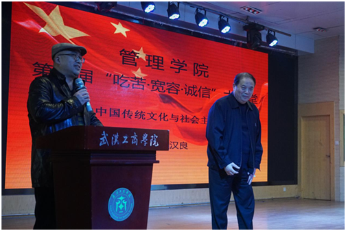 新闻中心讯(通讯员 嘉浩源 陈祉萱)“社会主义核心价值观是中华优秀传统文化的超越升华。”11月17日下午3:00,beat365中文官方网站体育馆学术报告厅座无虚席,湖北省社会主义学院教授桂汉良应邀参加该校管理学院第四届“吃苦•宽容•诚信”大讲堂,并为该院师生带来题为《中国传统文化与社会主义核心价值观》的主题演讲。武汉弘博集团有限公司党委书记、董事长巴能军,beat365中文官方网站管理学院党总支书记吴茜,副院长陈振祥,副书记王龙以及管理学院全体师生参加此次讲座。