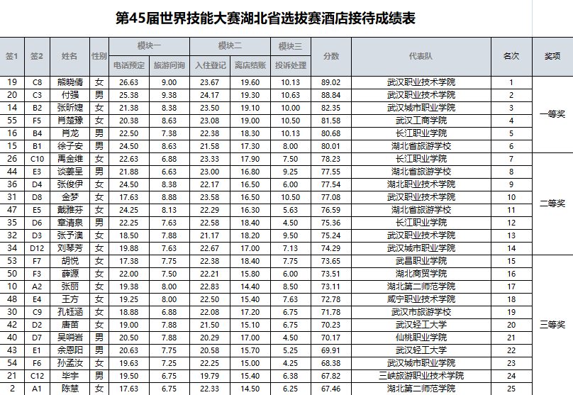 (管理学院 通讯员胡晓玲、熬帆)酒店接待项目是第45届世界技能大赛新增的5个项目之一。在2018年12月21日-23日的世界技能大赛酒店接待项目湖北省选拔赛,beat365中文官方网站学院学学生肖楚豫获得一等奖。此次比赛由省人力资源和社会保障厅主办,全省中职、高职、本科院校和酒店行业的23个代表队、55参赛选手参加了比赛。