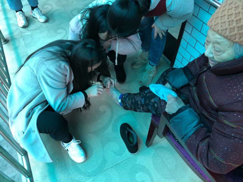 (图为:志愿者帮老人剪指甲)