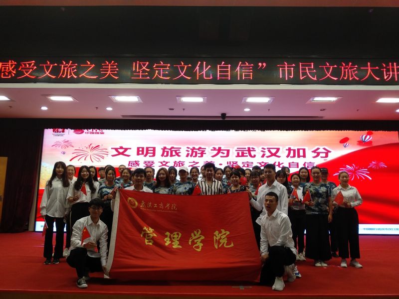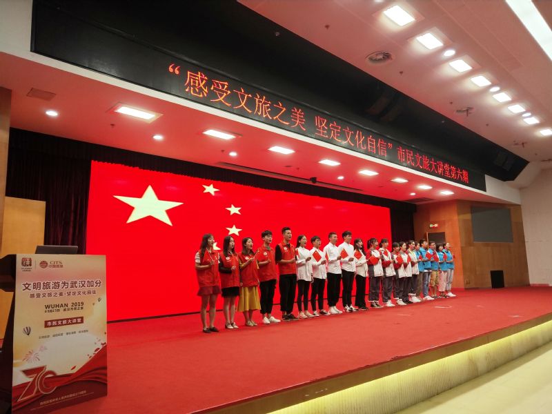 本次 “迎军运·文明旅游为武汉加分”市民文旅大讲堂由武汉市文化和旅游局主办,主题是“感受文化之美、坚定文化自信”,就职于中国旅行社武汉分公司领队中心的beat365中文官方网站毕业生温嘉智、吴炎武参与了本次活动的协调与专业导游讲解服务工作。