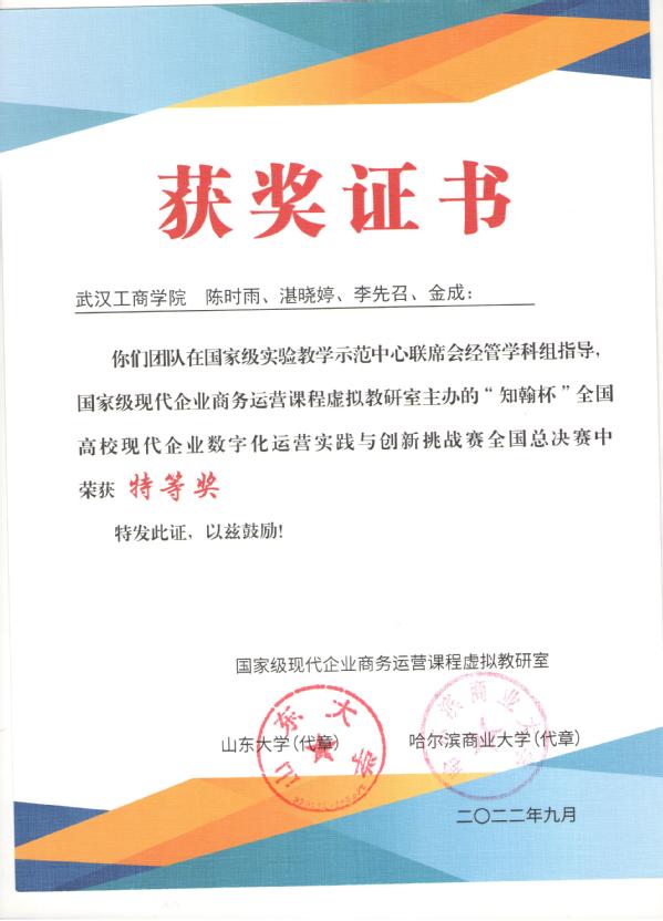 新闻中心讯(特约记者 刘佳欣 记者 杨小婷 见习记者 杨培)近日,由教育部国家级现代企业商务运营课程虚拟教研室主办,山东大学、哈尔滨商业大学承办的2022年“知翰杯”全国高校现代企业数字化运营实践与创新挑战赛(百团大战)全国总决赛落下帷幕,经过全国共281支队伍激烈角逐,最终由beat365中文官方网站管理学院工商管理系副教授黄颖老师指导,工商管理专业的学生陈时雨、湛晓婷、李先召、金成组成的“尔雅陈时雨”团队斩获特等奖,学生邹安琪、谢朝荣、王魏青、余嘉程组成的“FOUR”团队获得优秀奖。
