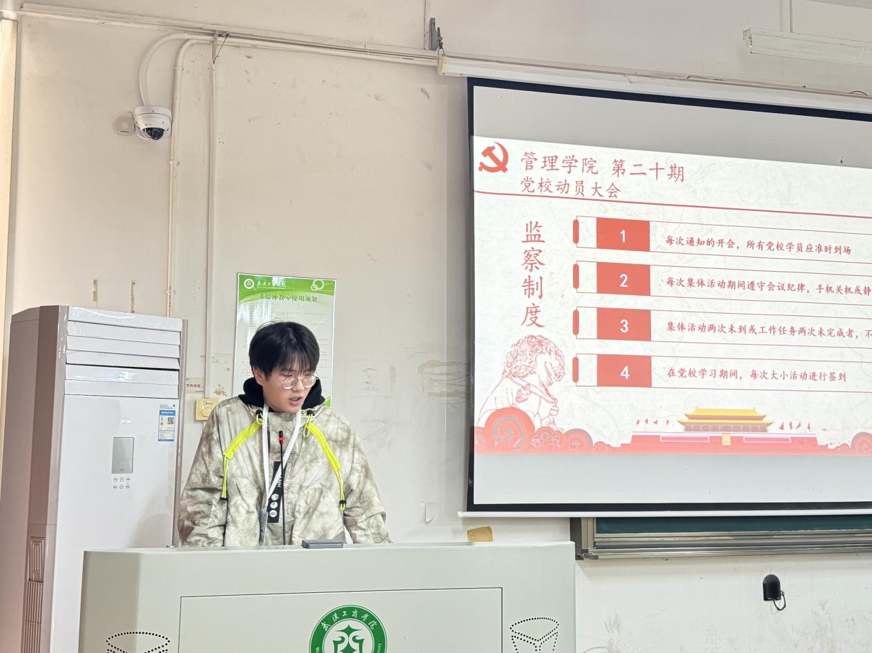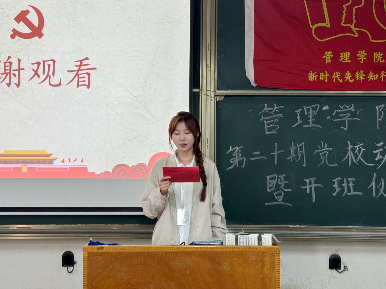 为了加强入党积极分子对党二十大精神的深入学习与理解,贯彻党的教育方针,引领新时代青年跟上党的步伐,贡献个人力量。管理学院第二十期党校动员大会暨开班仪式于2024年11月4日中午12:30在综合楼302教室举行,本次开班仪式由管理学院曾濛瑶主持。