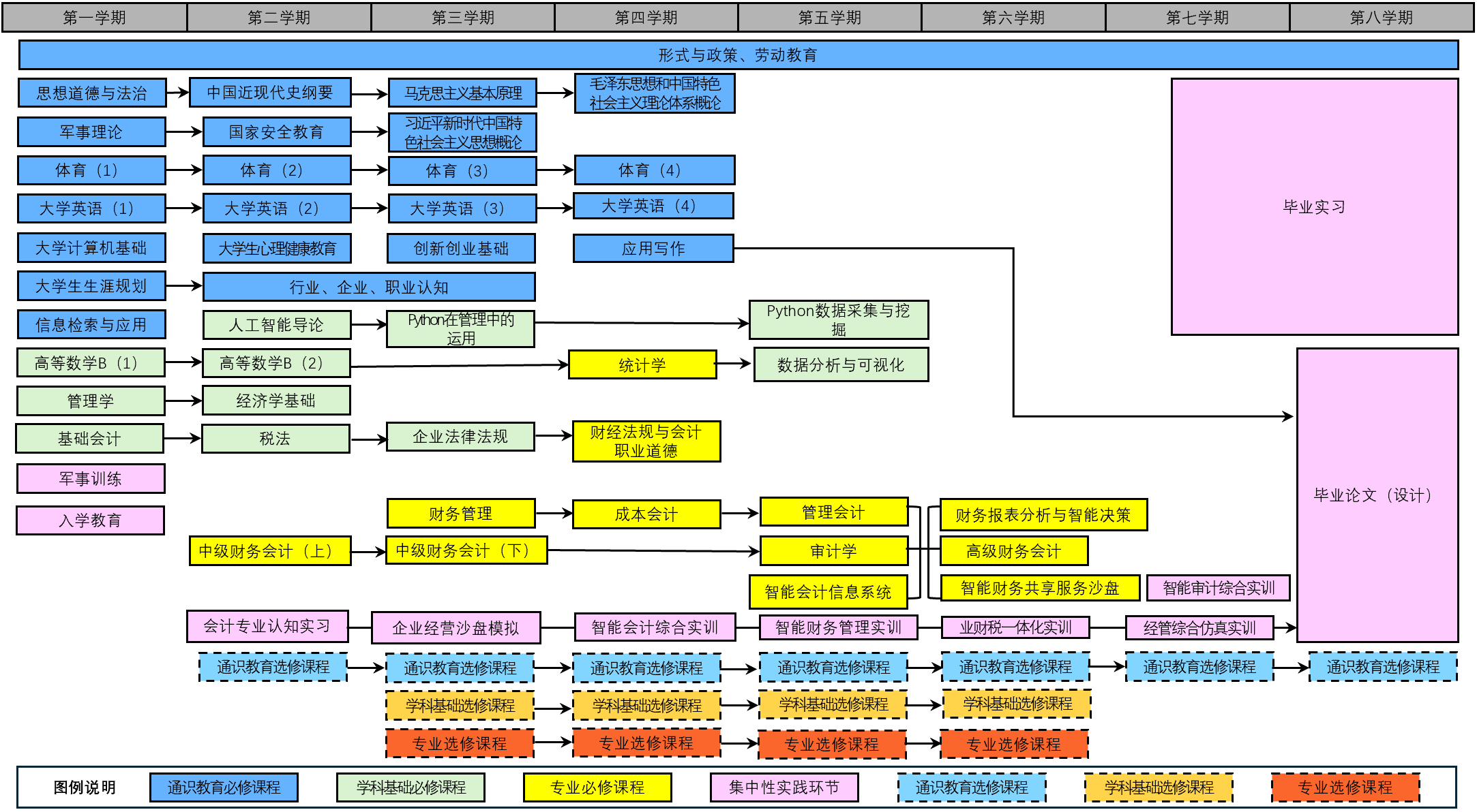 8.终身学习与持续发展能力:树立自主学习与终身学习的理念,能够跟踪会计行业前沿动态;通过考取CPA、CMA等执业资格证书,持续提升专业能力。 | 8.1树立自主学习与终身学习的理念,能够跟踪会计行业前沿动态,适应会计行业变革与信息技术发展,不断更新知识结构。 | 大学英语,人工智能导论,Python数据采集与挖掘,毕业论文(设计) |