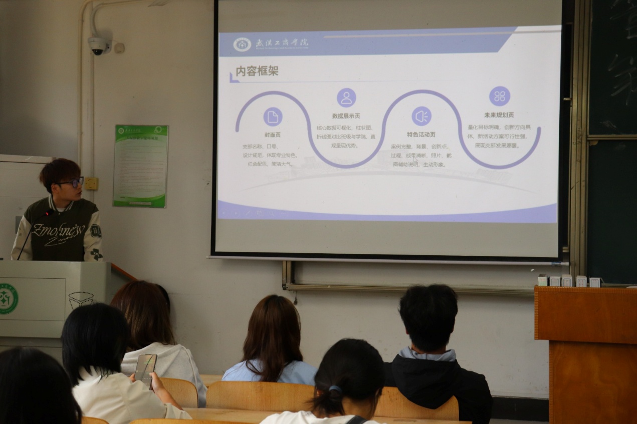 会议强调,本次五四评优活动将坚决抵制谎报虚报等欺骗行为和不公正行为的发生。并且组织部部长将PPT制作与答辩作为培训的第三个要点,从内容框架到答辩禁忌讲解全面。他表明这个方面要求负责人制作PPT时需要将支部名称、口号等放在封面页显眼处。PPT整体简洁大方体现出专业特色。在制作数据展示页时需要直观的呈现出自身优势,特色活动页必要时还需图片辅助说明。答辩时要严格控制在6分钟内,表述准确,用数据支撑观点。这样在后期的评选阶段对工作进程的加快有一定的作用。