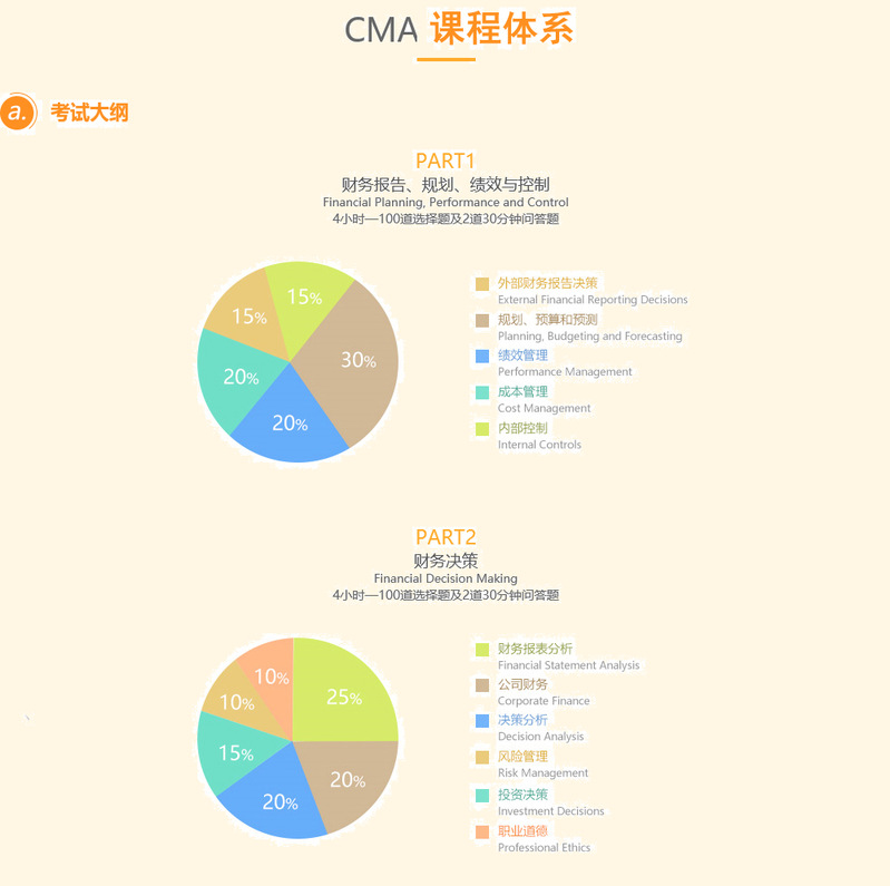CMA是美国注册管理会计师,新一代财务管理者的国际财务认证。专注于管理会计人才的培养和发展,以“财务支持战略决策,战略融于财务管理”为理念,帮助财务全面掌握“财务+管理”知识体系。侧重预算预测、内部控制、决策支持、风险管理、成本分析等内容。目的在于培养财务管理人员的知识广度和深度,使其能预测商业的需求及参与策略决策制定,支持企业的战略决策分析,有效地实行成本控制,推动企业业绩提升。