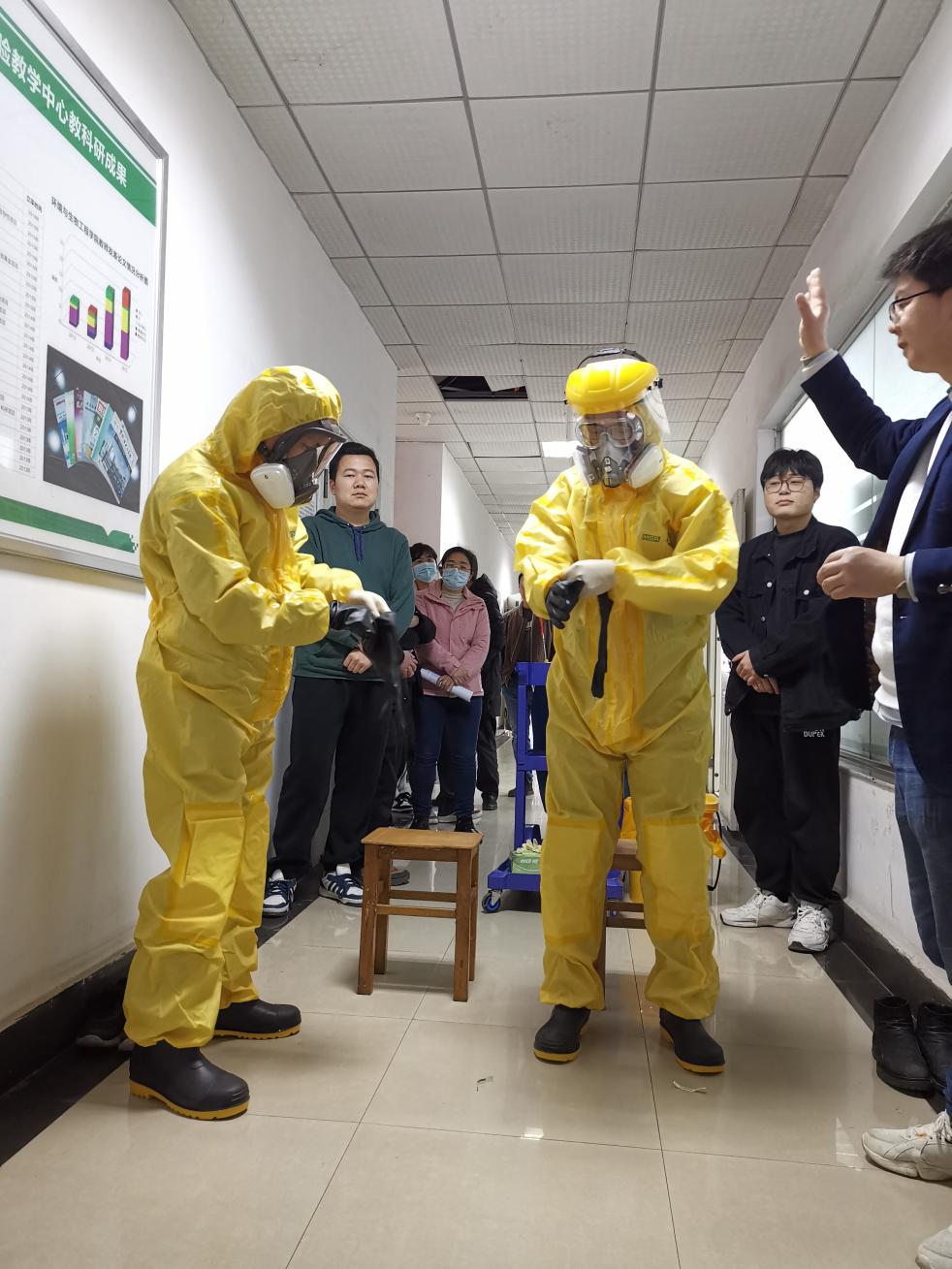 下午,为提高培训演练效果,让在场每位学生听得懂、看得清、学得会。演练过程让学生角色扮演实验室的相关人员参与其中,通过一边讲解一边示范,将危险化学品泄漏后实验人员个人救护、紧急动员、事故处置等应急处置规范化流程完整呈现。环生学院龚乃超老师、徐文广老师在演练中扮演应急处置小组成员,通过现场详细的展现了实验室安全防护设施的正确使用方法,以及应对危险化学品泄露的正确处置流程。
