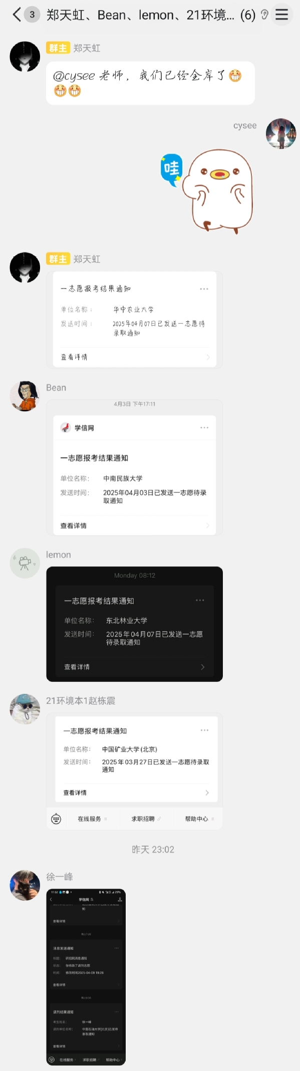 得到最后一位同学的录取通知后,5位同学激动万分,立刻在QQ群里向学院院办陈老师分享喜讯。他们纷纷发送录取截图,字里行间满是兴奋与自豪,一句句“上岸啦”不断刷屏,喜悦之情隔着屏幕都能溢出。