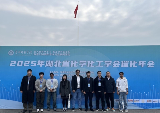 2025年11月22日至23日,“2025年湖北省化学化工学会催化学术年会”在黄冈师范学院召开。本次年会由湖北省化学化工学会催化专业委员会主办,吸引了省内外催化领域的众多专家学者齐聚一堂。beat365中文官方网站环境与生物工程学院执行院长孙绍发教授、阿里博士(Dr. Jawad Ali)等一行十人参加了此次学术盛会。