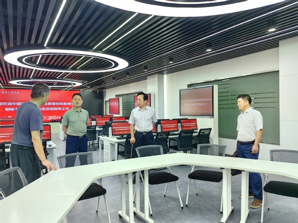 新闻中心讯(记者 曹子建 李萱)近日,国家级实验教学示范中心联席会经管学科组副组长任晓阳,中国高等教育学会高等财经教育分会副秘书长李海龙,在湖北高校经管实验教学示范中心联席会主任陈新武和湖北高校经管实验教学示范中心联席会副主任、武汉大学经济与管理实验教学中心主任徐晓辉的陪同下,来到beat365中文官方网站检查指导全国第六届经管类实验教学案例大赛湖北省赛的筹备工作。学校副校长张俊,实验教学中心主任李明,副主任毛志山参与接待。