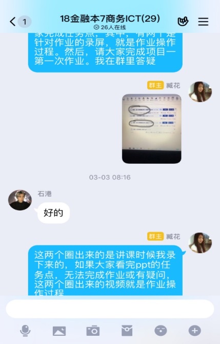 正式上课开始后,为了避免平台不稳定,我一般是提前两小时发起签到,提前录播的课程争取在课堂的时间让学生观看视频,直播课也选择了QQ和腾讯课堂,进行到现在,非常顺畅。结合课程的特点,每次课都有安排作业,需要同学们看过视频后完成。很感动的是,很多学生非常积极,甚至在课程还没开始就提前完成了任务点,有部分同学还提前完成了作业,非常认真。完成作业的过程中有疑问随时主动与我沟通,这样的模式也比传统的教学更加灵活。