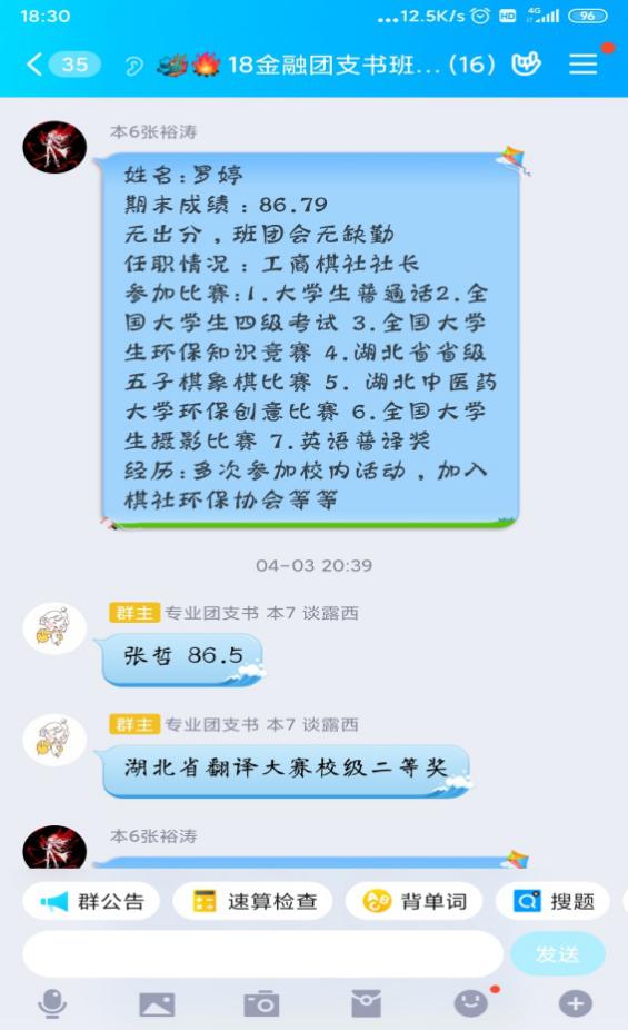 与班委协商定期召开线上班委会议,了解大家的思想动态和安全问题。与班委提前协商好固定的时间,在QQ平台召开语音会议。召开“同上一堂思政大课”的学习会议、健康平台填写须知会议、学生信息统计会议、五四评优会议、班团会召开细则会议,还有学生的退课和网络课程学习会议等。通过定期的班委会会议,不仅及时了解了学生的思想动态,传达了学校的相关工作,还做好了班级整体工作的安排,确保了疫情期间学生工作的顺利运转。