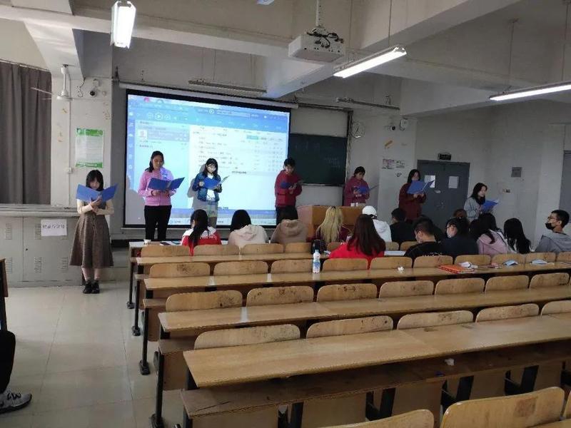 10月8日中午12:30,“百生讲坛”活动—经济与商务外语学院的初赛在综合楼407举行,工作人员早早的来到现场进行准备工作,参赛人员也已经开始候场,用抽签的方式决定了出场顺序后,活动就正式开始啦,首先由经济与商务外语学院分团委组织部工作人员宣布活动开始。这次比赛分为院赛和校赛,院赛与校赛奖项设置相同,优秀主讲人与活力团支部各评出一等奖1名,二等奖2名,三等奖3名,优秀奖4名。这次活动将推选出“优秀主讲人”和“活力团支部”,比赛结束后,我院将选出院级的优胜者,然后推荐给校级。活力团支部评选设置了两个环节:一是支部学“习”成果介绍;二是支部风采展示环节。团支部代表围绕思想引领、“三会两制一课”、组织建设、志愿服务、校园文化、文艺体育活动等方面内容,充分介绍支部的学“习”成果。在风采展示环节,各参赛成员需要向观众及评委展示抗疫作品,结合专业特色,充分诠释了支部建设的特色与亮点,展现支部成员的精神风貌,展现了基层团支部活力和凝聚力。使广大团员青年更加全面、准确地深入学习,主动关心国家大事,进一步形成对党的深刻认识和理解。