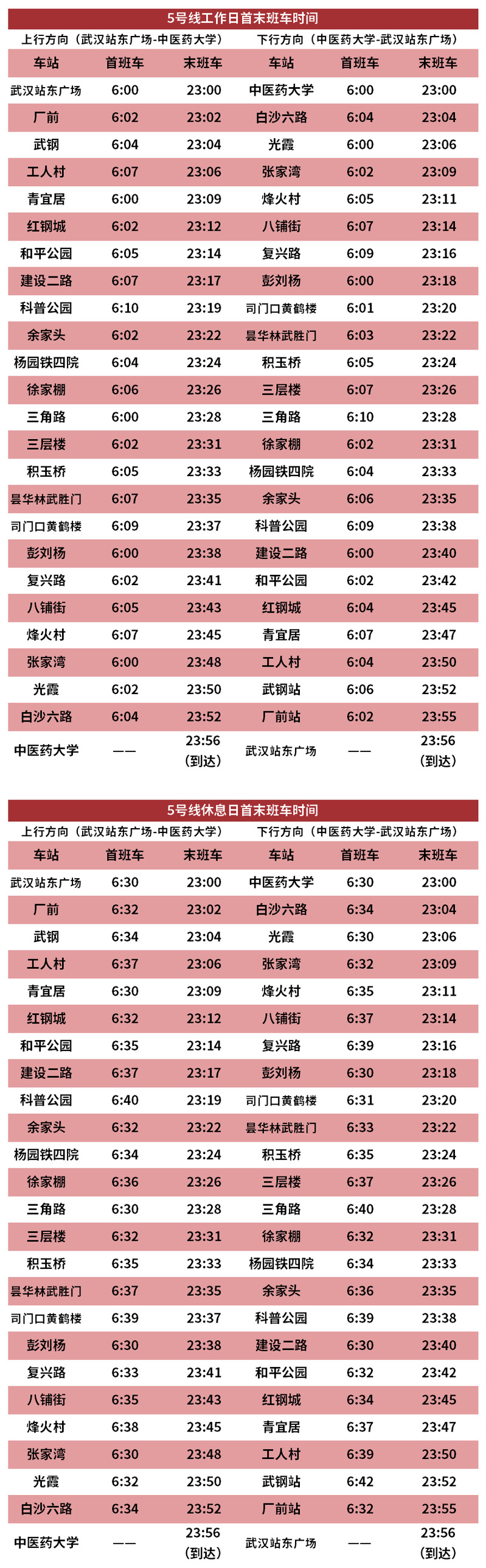 5号线顺长江而建,南起中医药大学,途经复兴路、司门口、武昌滨江商务区、青山区至武汉火车站东广场,南北向贯穿武昌全镇,线路全长约35.1公里,设站25座,其中地下站21座,高架站4座。可与已通车的2、4、7、8号线换乘。