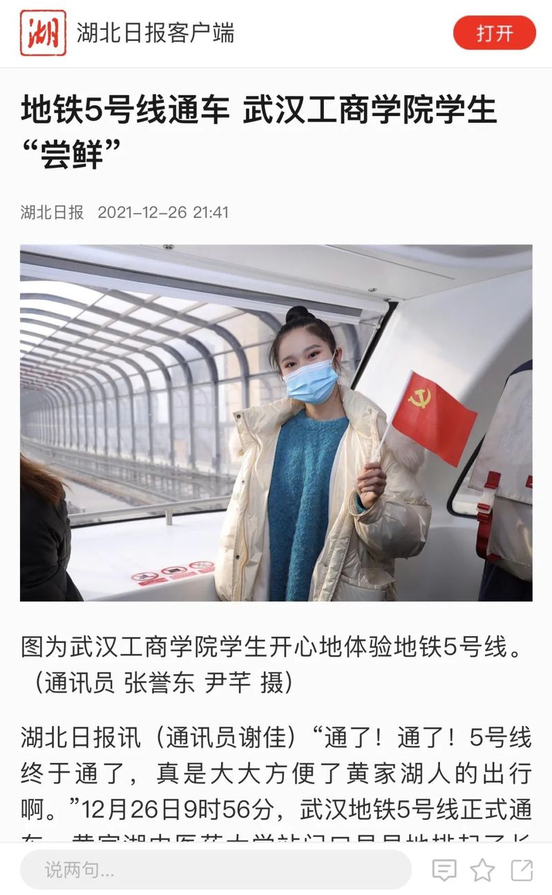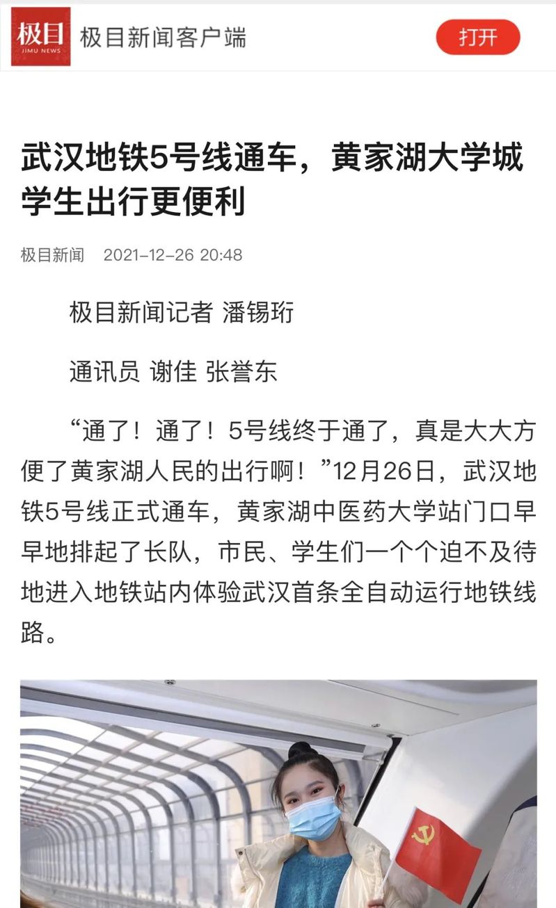 学校学子在5号线开通首日乘坐打卡,热情分享乘车体验,受到了新华网、人民网、湖北日报等中央级、省级媒体的关注和报道。