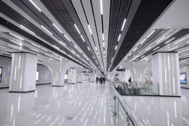 5号线设有昙华林武胜门站、司门口黄鹤楼站、彭刘杨路站、复兴路站等25个站,沿途经过黄鹤楼、长江大桥、江滩、红巷、昙华林……一路“打卡”武汉经典的风景。5号线还设有特色站点,武汉站东广场站吊顶呈水波状,立柱柱头如展翅翱翔的黄鹤,两者寓意非凡;和平公园站设有一座主题名为《童趣》的艺术墙,郁郁葱葱的树木、孩童无忧无虑地玩耍的场景,描绘了一幅具有水墨意境的优美画卷,让游客不禁驻足观赏;徐家棚站设有一条长达225米的艺术长廊,采用了江城特色的芦苇作为设计元素,呈现出自然之美、诗意之美,使人仿佛置身于江边芦苇荡的环境中。