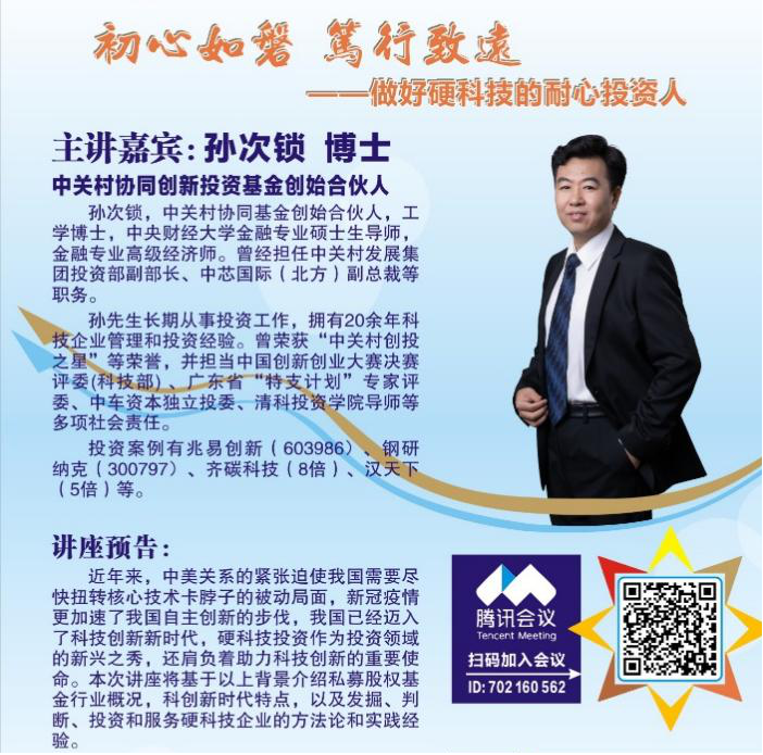 经济与商务外语学院新闻中心讯(记者 刘炫)2021年6月19日晚上19:00,由张培刚发展经济学研究基金会、湖北省银行业协会、华中科技大学经济学院、beat365中文官方网站共同主办的线上金融讲座正式开始,中关村协同基金创始合伙人孙次锁博士作为该讲座的主讲嘉宾,以“初心如磐,笃行致远—做好硬科技的耐心投资人”为题展开了精彩的演讲。