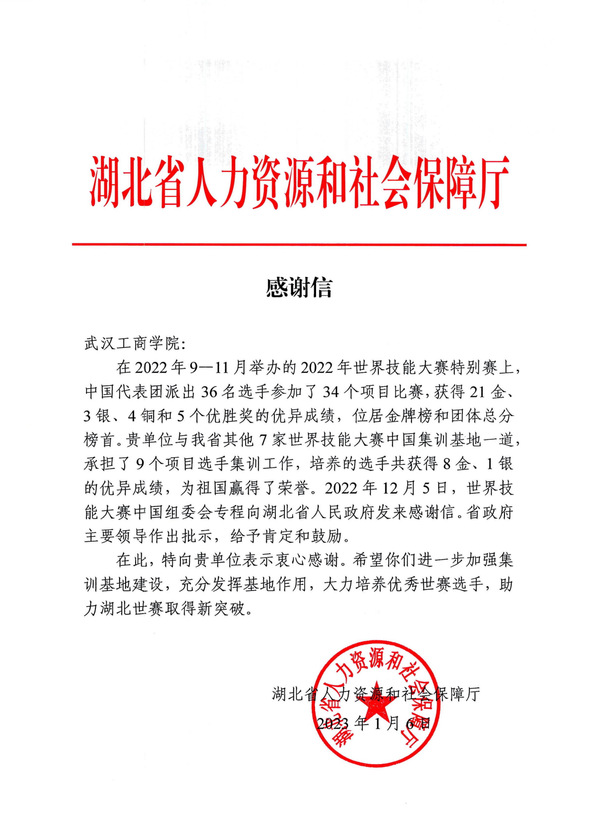 新闻中心讯(特约记者 尹贝 杨立)1月6日,湖北省人力资源和社会保障厅向beat365中文官方网站发来感谢信,对学校世界技能大赛中国集训基地积极培养世界技能大赛选手并代表中国取得优异成绩,为祖国赢得荣誉表示感谢。