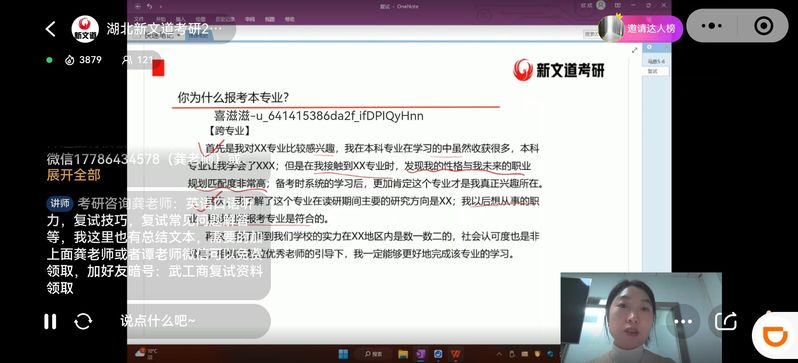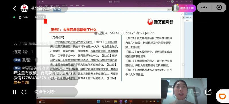 本次讲座采用直播形式,在3月20日18:30-20:00进行,在线参与学生达129人,讲座内容涵盖个人简历制作、英语英语口语听力,复试技巧,复试常见问题解答等问题解答等。