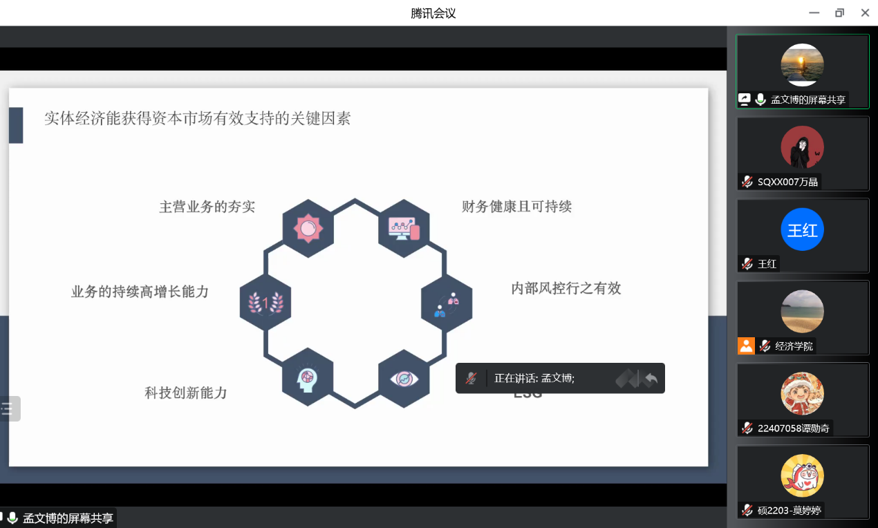 此外,孟文博继续介绍到实体经济能获得资本市场有效支撑的关键因素包括六个方面,具体为:第一,企业的主营业务必须要非常的清晰和夯实;第二,资本市场上有持续高增长能力的企业会更加受大家的关注;第三,企业具备较强的科技创新能力;第四,企业财务的健康和可持续;第五,企业内部风控行为的有效;第六,企业的环境信息披露、社会责任与公司治理信息。前三个方面为企业的经营方面的要素,后面三个方面为企业最基本的要素。